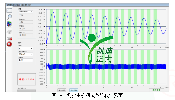 测控主机协调整个系统的运行,通过无线网络控制高压恒流源升压蓄能,控制高压固态开关闭合并采集、存储和分析分压器/耦合器采集的局放振荡波信号和局放信号。测控主机运行的测试系统软件界面如图4-2。