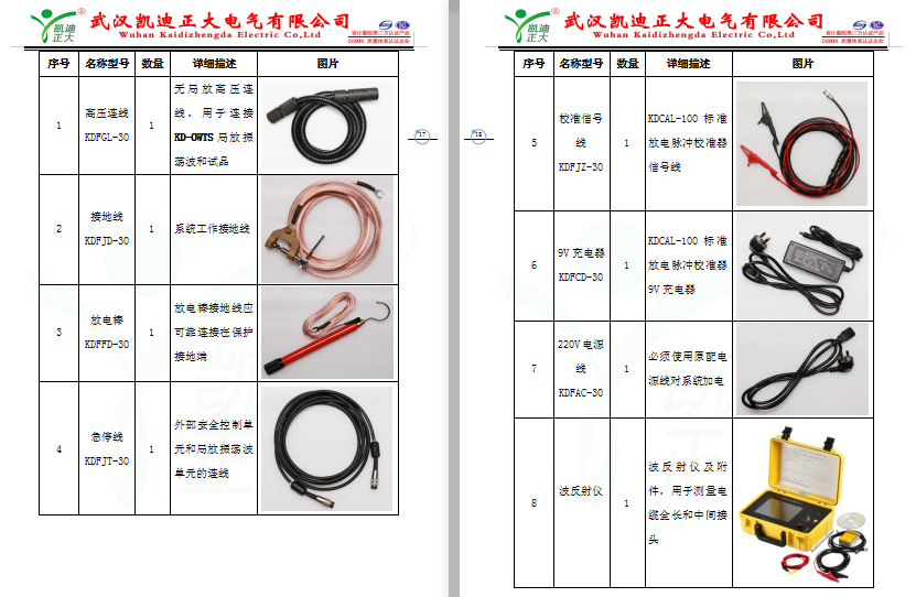 KD-OWTS配套附件如表4-1,现场试验时必须使用系统原配高压连线、电源线和接地线进行连接,如线缆有缺损,需联系厂家维修。