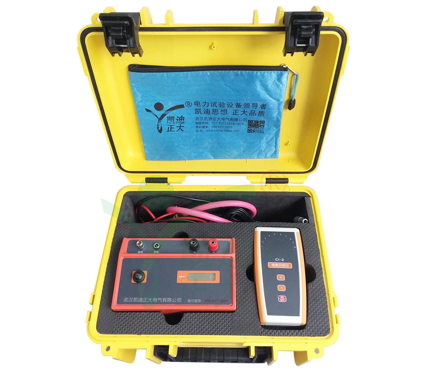 KD-214A 电缆识别仪在电力电缆架设、迁移、维护以及故障处理中用来判别一束电缆中欲寻找的一根特定的电缆;具有判别电缆准确、快速、操作简单、应用范围广等特点。它是电缆施工及维护工作中不可缺少的检测仪器。停电电缆识别仪,在发射端采用单片机技术对发射信号进行编码、功率驱动,驱动大口径卡钳将信号耦合到带电电缆上。接收机中的单片机对接收的相位编码信号解码和相位识别。根据目标电缆上的信号相位特征的唯一性将目标电缆从一大束其它电缆中识别出来。它是一种轻小型、紧凑型、便携式仪器。适用于各种类型的高低压动力电缆。