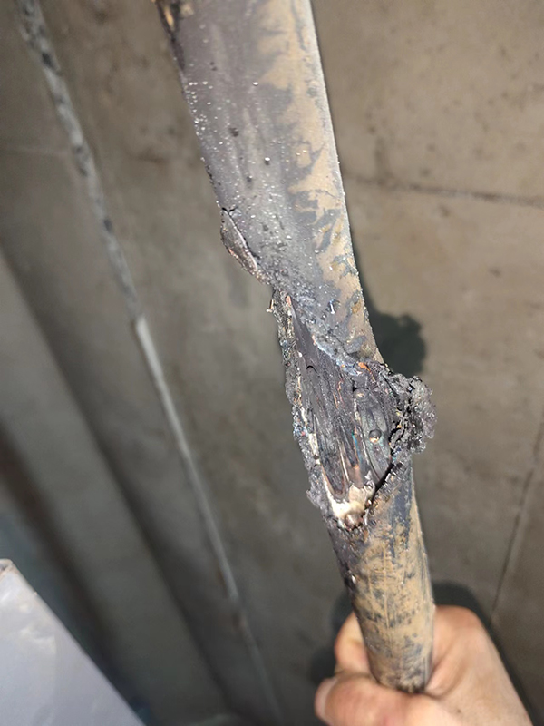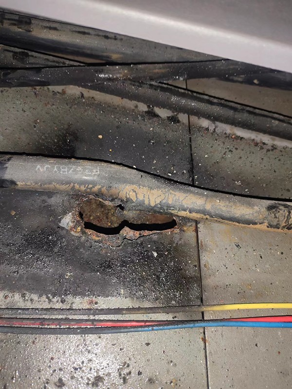 现场曹队和现场工友一起顺着桥架下面往前找,没多远就听到放电声,而且声音大得很。十几分钟找出故障,而且电缆半边己经炒糊了,直接见到里面线芯。