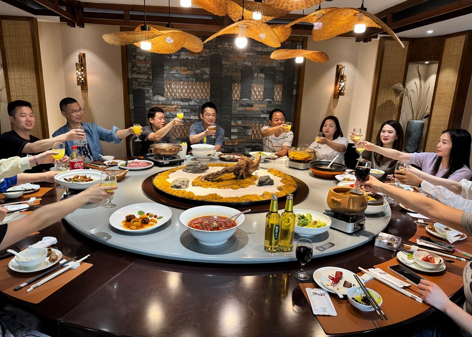 聚餐现场气氛热烈而欢乐,此外,餐厅还组织了生日祝福环节,大家纷纷举起酒杯,为寿星送上诚挚的祝福,场面温馨感人。