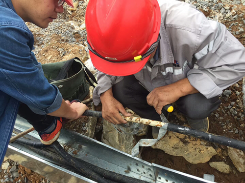 每条电缆断开送电柜和輸电箱后,进行电缆检测。当第一条电缆进行绝缘强度测试后,分析出B线出现故障。整过电缆组线进行绝缘强度测试之后,发现同一个问题,都是B线出现故障。得出这一結论后,与甘肃风力发电场工作人员现场沟通,进行下一步工作按排。现场用高压闪络法进行测试,当进行升高压测试发出电流生响后,就顺着电缆寻找,直到找到声音停止位置。第一根电缆线故障点在100米,现场工作人员进行现场修复,剖开电缆线,发现里面有水滴和有一些小石子。