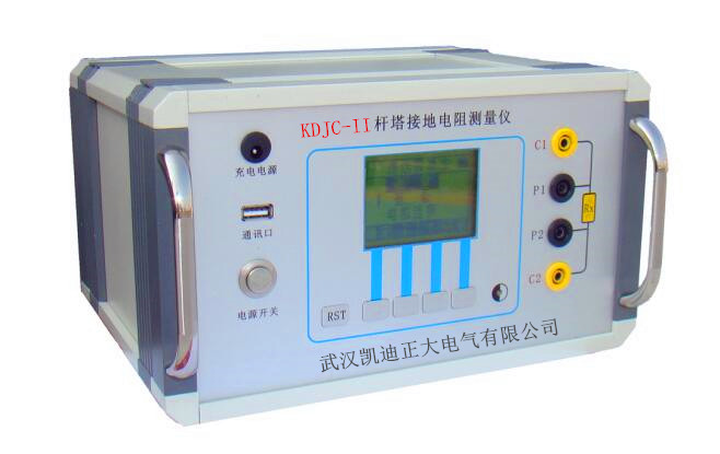 KDJC-III杆塔接地检测装置适用于测量避雷线直接接地的输电线路杆塔接地电阻,杆塔塔身和本档避雷线电阻、后续(或两侧)各档链行回路等效阻抗中的电阻分量等形成一个回路,通过测量仪内部电源电势,在该回路中产生电流,通过电路欧姆定律得出所测杆塔的接地电阻值。