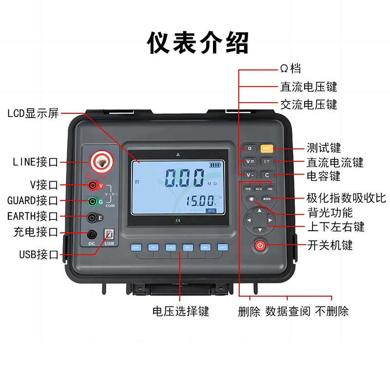 功能:绝缘电阻测试,电压测试,电流测试,电容测试