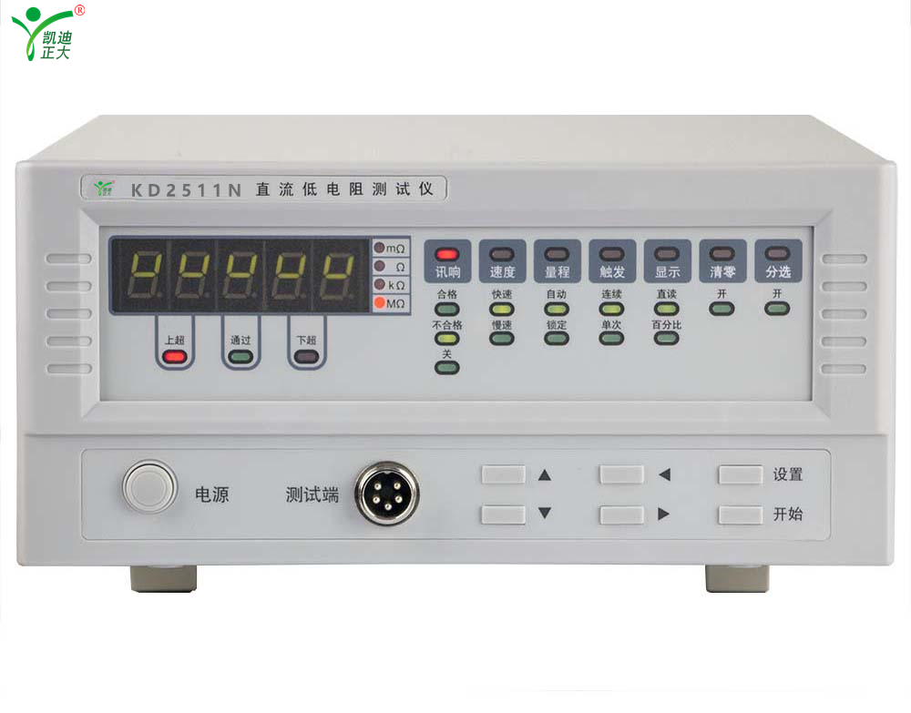 KD2511N微电阻测试仪使用了高精度恒流流经被测件以及四端测量,有效的消除了 引线误差;使用了高精度 AD 转换,适合用户进行高精度测量。本仪器 拥有的分选功能(上超,合格,下超)允许用户自由地设置电阻上下限 以及标称值,提高了本仪器的测试效率。