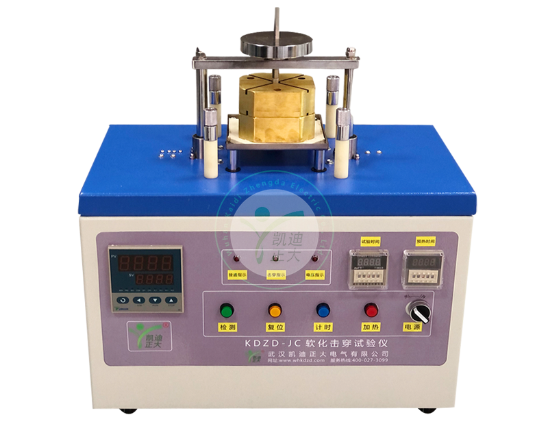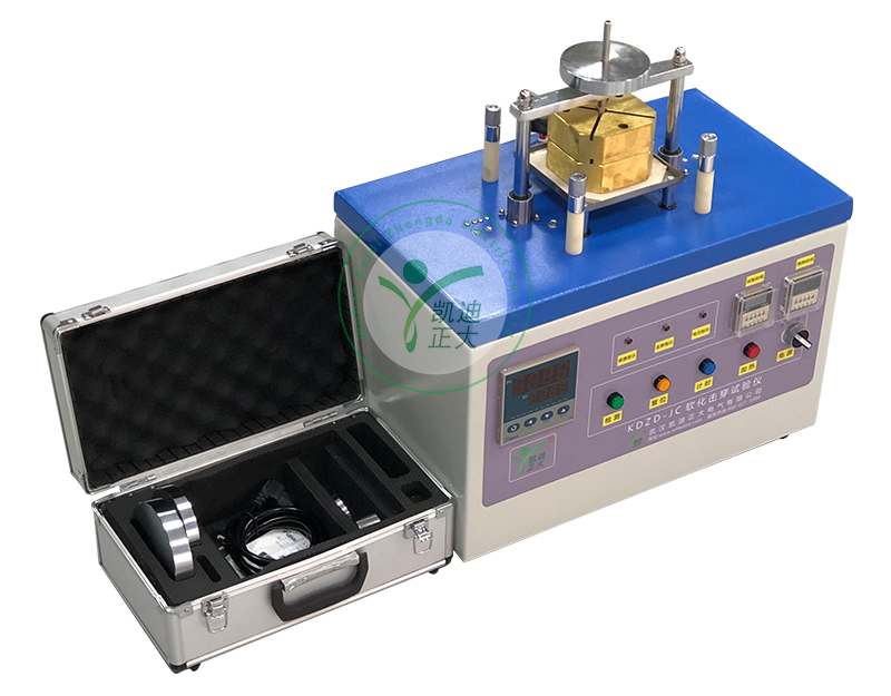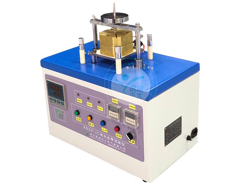 KDZD-JC软化击穿试验仪用于检测3.00mm及以下漆包线在热状态下漆膜软化后的绝缘性能,根据设定的预热温度、试验时间、仪器自动完成对试样的预加热、加负荷、加试验电压,达到试验时间或试样被击穿时即卸负荷,发出声光信号。该仪器采用热电偶测温,智能温度控制,能自动调节和显示试验温度、测试部分采用集成电路,整个测试过程自动完成。